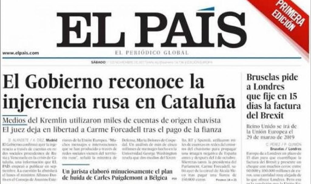 En una nota publicada por el diario El País el 11 de noviembre titulada: “El Gobierno constata la intervención en Cataluña de ‘hackers’ procedentes de Rusia y Venezuela”, se asegura que “El Gobierno (español) da por contrastada la intervención de hackers procedentes de Rusia y Venezuela en la crisis institucional de Cataluña y afrontará esta cuestión en el Consejo de Asuntos Exteriores de la Unión Europea, que se celebrará el próximo lunes (hoy)”, declararon el portavoz gubernamental, Íñigo Méndez de Vigo, y la ministra de defensa, María Dolores de Cospedal.