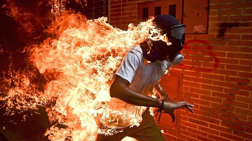 2. La foto tomada por el venezolano Ronaldo Schemidt, de la agencia AFP, muestra al manifestante José Víctor Salazar Balza (28) en llamas durante los enfrentamientos con la policía antidisturbios durante una protesta contra el presidente venezolano Nicolás Maduro en Caracas (Venezuela) el 3 de mayo de 2017.