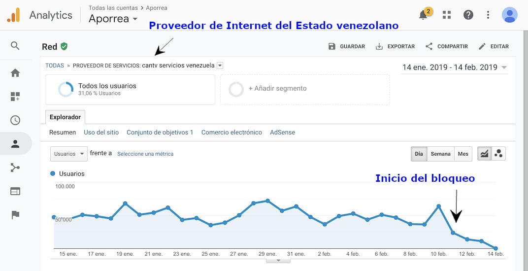 Las evidencias del bloqueo son numerosas, no sólo a través de nuestro panel de análisis de visitas (Google Analytics), sino por la gran cantidad de usuarios que se han quejado en redes sociales, muchos atribuyendo su imposibilidad de conectarse a problemas técnicos de nuestra parte.