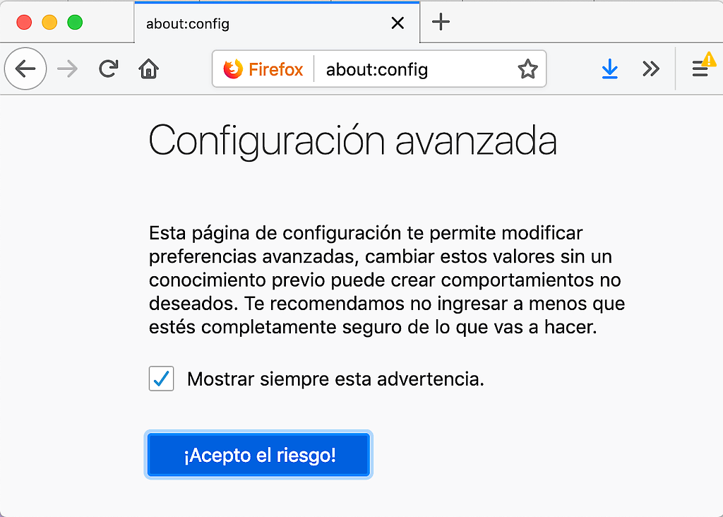 1) Una vez que haya instalado el nuevo Firefox, ábralo y en la barra de direcciones URL, escriba "about:config" (sin comillas) y pulse ENTER. Firefox da una advertencia del riesgo de alterar la configuración avanzada. Pulse el botón "Acepto el Riesgo".
