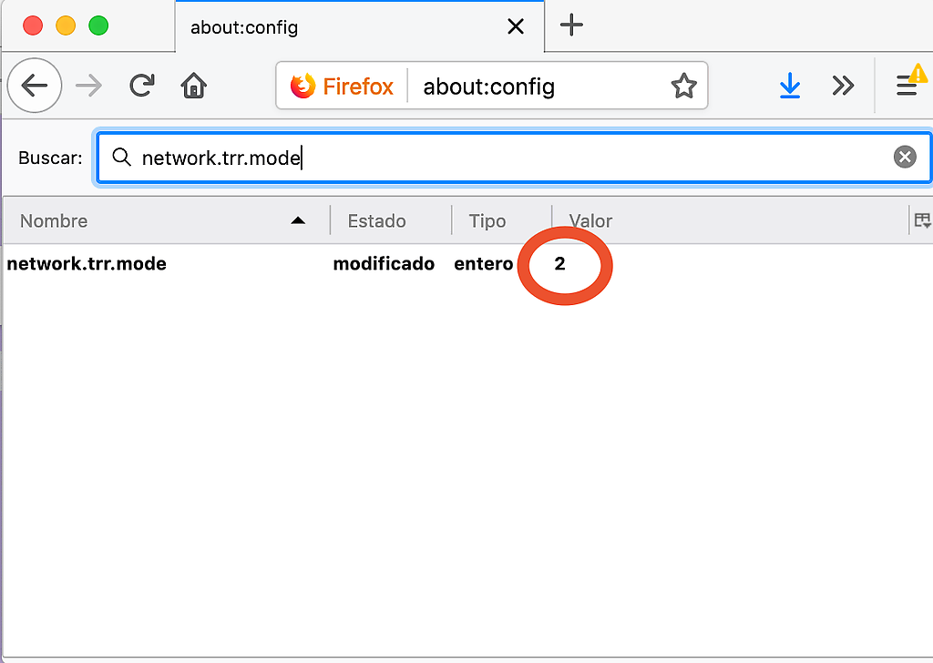 2) En el recuadro de "Buscar", escriba "network.trr.mode" (sin comillas). Cuando le aparezca el resultado de la búsqueda, haga doble-click para cambiar el valor a "2" (sin comillas).