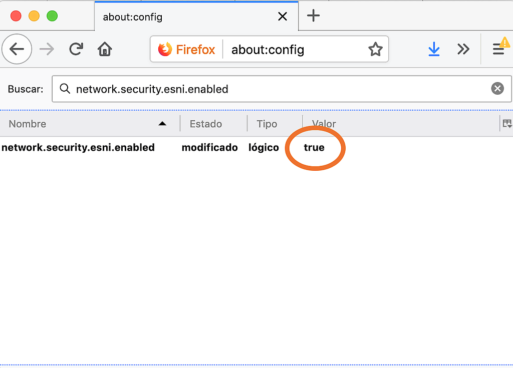 3) En el recuadro de "Buscar", escriba ahora "network.security.esni.enabled" (sin comillas). Cuando le aparezca el resultado, haga doble-click para cambiar el valor de "false" a "true".