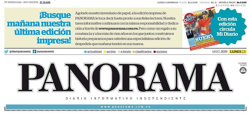 En la portada de este lunes del centenario diario zuliano, se dejó saber que mañana martes los lectores podrán adquirir la última edición impresa, en un cintillo que reza: "Agotado nuestro inventario de papel, a la edición impresa de Panorama le toca decir hasta pronto a sus fieles lectores.