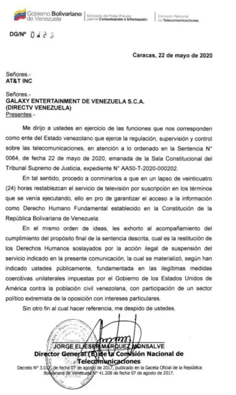 22.05.20 - La Comisión Nacional de Telecomunicaciones (Conatel), en pleno ejercicio de sus funciones, instruyó a la empresa Galaxy Entertainment de Venezuela S.C.A (DirecTV Venezuela) restituir el servicio de televisión por suscripción en un lapso de 24 horas, con el objetivo de ”garantizar el acceso a la información como derecho humano fundamental establecido en la Constitución de la República Bolivariana de Venezuela”.