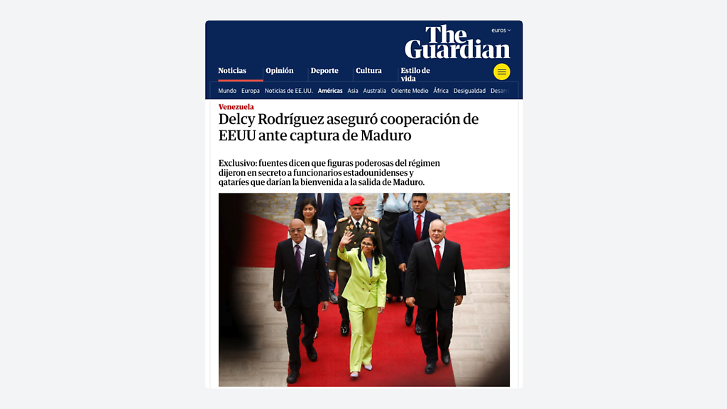 El Gobierno de Venezuela calificó este jueves de noticia falsa un reporte del medio británico The Guardian, en el que se afirma que la presidenta encargada del país suramericano, Delcy Rodríguez, aseguró ya antes del secuestro del presidente Nicolás Maduro que cooperaría con EE.UU.