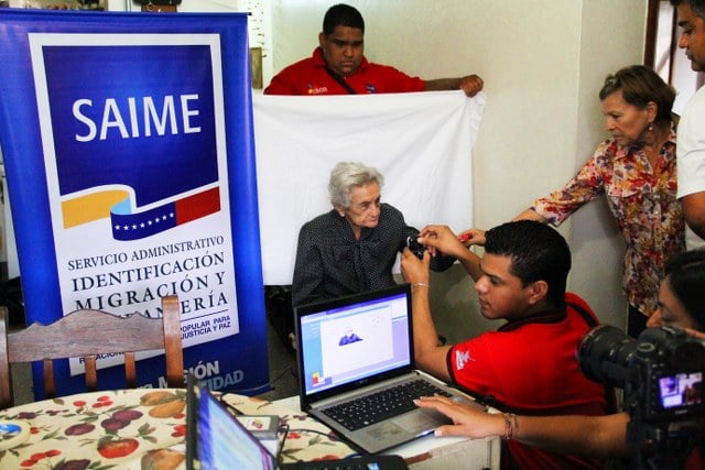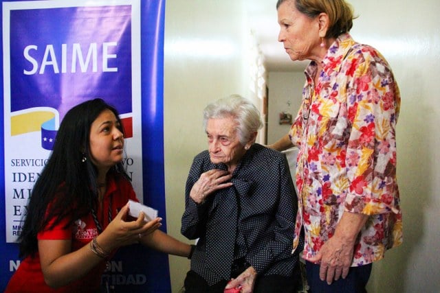 Septiembre 01 de 2014.- Cumpliendo con las políticas de justicia social promovidas por el comándate eterno, Hugo Rafael Chávez Frías, el Servicio Administrativo de Identificación, Migración y Extranjería (SAIME) desplegó la Ruta Identidad José Gregorio Hernández en la parroquia San Pedro de Caracas para renovarle la cédula de identidad a la señora Rita Rull de 101 años quien debido a su avanzada edad se le dificultaba trasladarse hasta una oficina.