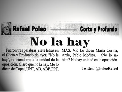 “Fueron tres palabras, siete letras en el Corto y Profundo de ayer, “No la hay”, refiriéndome a la unidad de la oposición. Claro que no la hay. Me lo dicen de Copei, UNT, AD, ABP, PPT, MAS, VP. Lo dicen María Corina, Arria, Pablo Medina… ¿No lo sabían? No hay unidad en la oposición”, se desprende del texto.