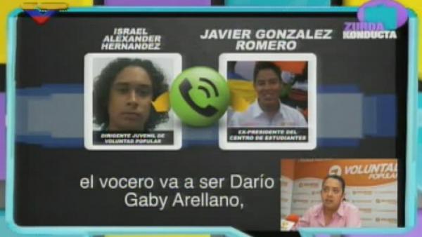2 abril 2014 - En un audio presentado en el programa Zurda Konducta, que transmite VTV, se dio a conocer la conversación entre Israel Hernández y Javier González (ambos dirigentes estudiantiles del partido político Voluntad Popular), quienes hablan sobre la entrega de un incentivo a jóvenes violentos, con el propósito de mantenerse en unas actividades dentro de la jornada de protestas que llevan a cabo sectores de la derecha venezolana.