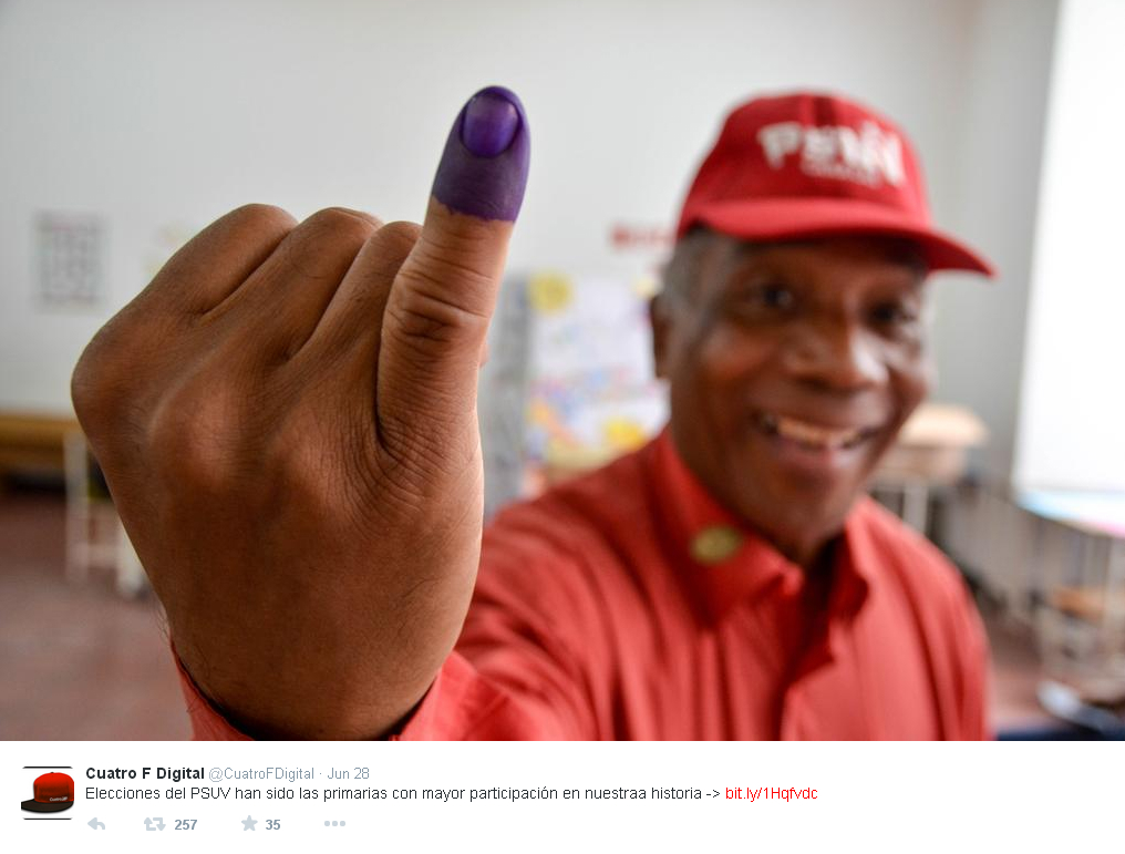 30 junio 2015 - La derecha venezolana una vez más pretende descalificar un proceso democrático en el que el poder popular expresa su apoyo a la Revolución Bolivariana y al Partido Socialista Unido de Venezuela (Psuv). Este domingo no pararon las patrañas de la contrarrevolución en redes sociales desacreditando las elecciones internas del partido rojo, en la que se eligieron a los candidatos revolucionarios para los comicios parlamentarios del 6 de diciembre próximo.