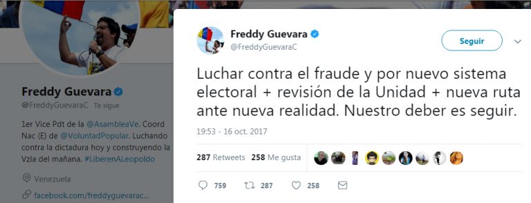 Quizás el mensaje que ofrece más luces sobre esta repetida historia de la derecha en Venezuela, la publicó el diputado Freddy Guevara -célebre por acompañar y avalar la actuación de encapuchados, paramilitares y terroristas en las pasadas guarimbas callejeras- cuando colocó estas "recomendaciones" que muestran que algo pasa en la llamada Unidad, tras las dos derrotas consecutivas en menos de tres meses que les ha propinado la mayoría de los venezolanos y venezolanas.