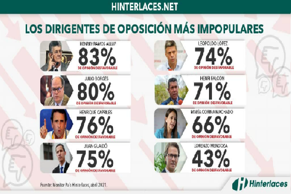 11.05.21 - El más reciente estudio del Monitor País Hinterlaces reveló quiénes son los dirigentes de oposición más impopulares en Venezuela. La investigación se realizó entre el 14 y el 25 de abril de 2021 en hogares de todo el país, 15% de los estratos A, B y C y 85% de los estratos D y E