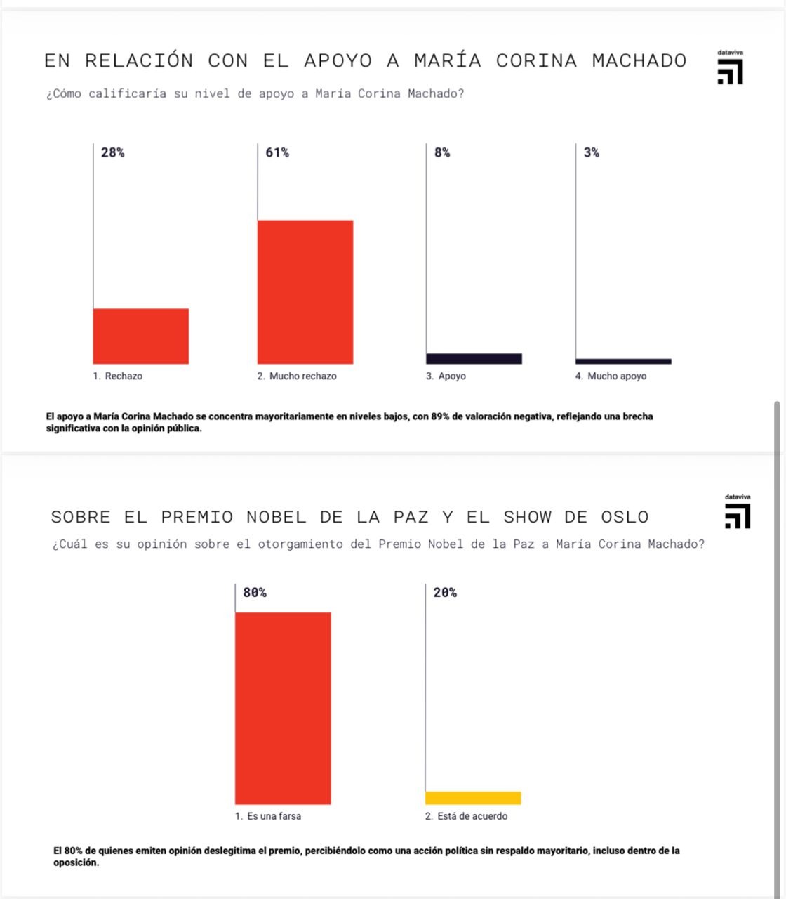 La encuesta también revela una deslegitimación mayoritaria del Premio Nobel de la Paz otorgado a Machado. Entre quienes emiten opinión, el 80 % considera que dicho reconocimiento es una farsa, percibiéndolo como una acción política sin respaldo social amplio ni capacidad de cohesión, incluso dentro de sectores de la propia oposición.