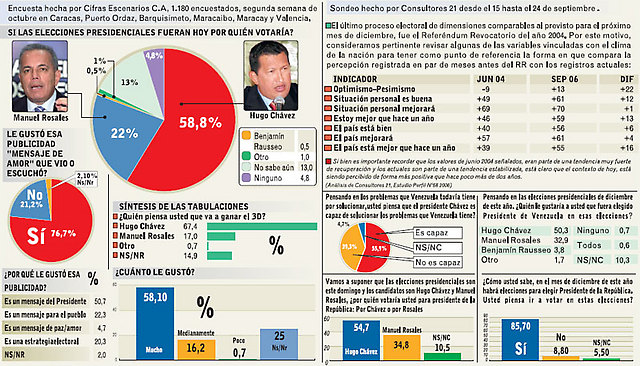 Con respecto a la intención de voto, Consultores 21 elaboró una encuesta, la última semana de septiembre, en el que Hugo Chávez (58,8%) aventaja al candidato opositor, Manuel Rosales (22%), por más de 35 puntos.