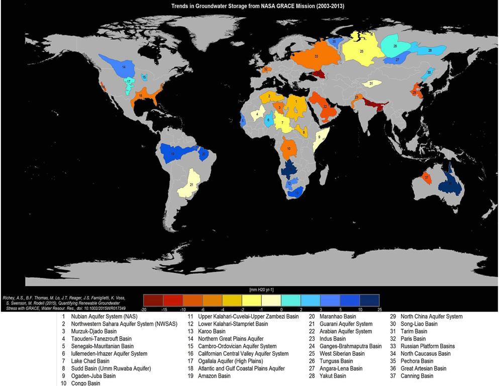 Los acuíferos subterráneos suministran el 35 por ciento del agua utilizada por los seres humanos en todo el mundo. Los científicos habían sospechado durante mucho tiempo que los seres humanos estaban gravando el suministro de agua subterránea del mundo, pero los datos de la NASA fueron la primera evaluación detallada para demostrar que los principales acuíferos están luchando para mantenerse al día con las demandas de la agricultura, el crecimiento de la población, el turismo termal mal desarrollado y las industrias como la petrolera y minería.