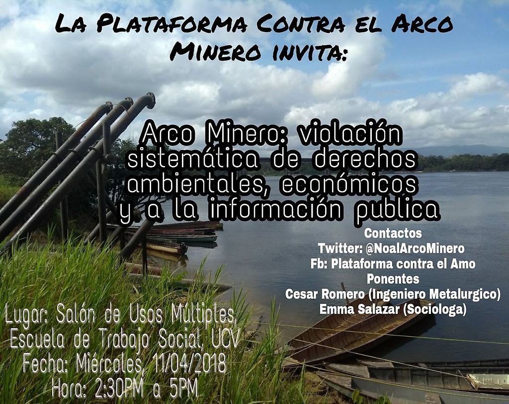 09/04.- La Plataforma contra el Arco Minero se complace en invitar al público ucevista y la ciudadanía en general al foro abierto "Arco Minero: Violación sistemática de los derechos ambientales, económicos y a la información publica" que se realizará en el salón de usos múltiples de la escuela de Trabajo Social en la UCV el próximo miércoles 11 de abril de 2:30pm a 5pm.