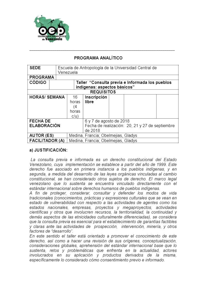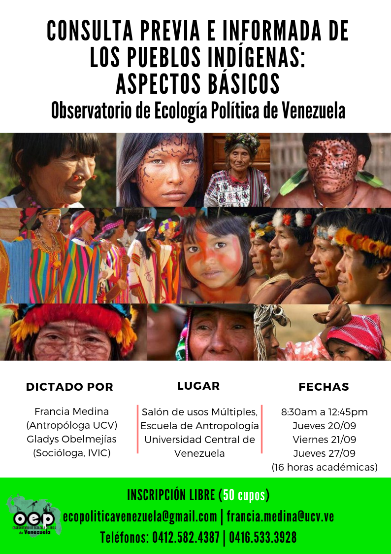 El día Jueves 20 de Septiembre se dará inicio al taller “Consulta previa e informada de los pueblos indígenas: aspectos básicos“, organizado por el Observatorio de Ecología Política de Venezuela y dictado por la antropóloga Francia Medina y la socióloga Gladys Obelmejías en la Escuela de Antropología de la Universidad Central de Venezuela.