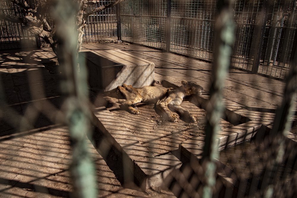 Debido a que los empleaos del desahuciado Parque Al-Qurashi, como se conoce el zoo de Jartum, no han podido alimentar y cuidar a los animales, muchos han muerto o han sido desalojados, quedando atrás sólo tres leones esqueléticos, incluida una leona.