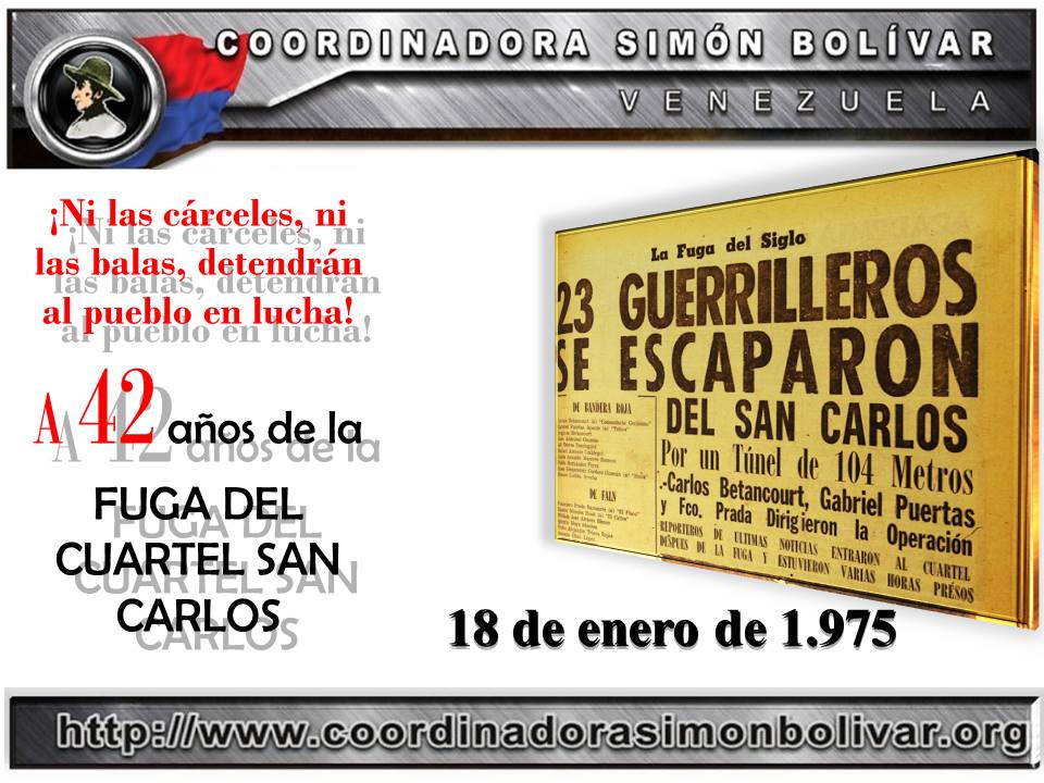 Con orgullo rebelde, combativo y libertario, los militantes de la Coordinadora Simón Bolívar rendimos tributo a quienes, como muestra de constancia, convicciones y espíritu de lucha, un 18 de Enero de 1975, en la ciudad de Caracas, realizaron la digna fuga del Cuartel San Carlos.