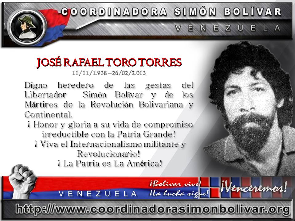 Desde la Parroquia 23 de Enero, hacemos un merecido homenaje al Camarada José Rafael Toro Torres, digno heredero de las gestas del Libertador Simón Bolívar y de los Mártires de la Revolución Bolivariana y Continental. ¡Honor y gloria a su vida de compromiso irreductible con la Patria Grande! ¡Viva el Internacionalismo militante y Revolucionario! ¡La Patria es La América! ¡Hasta la Victoria Siempre!