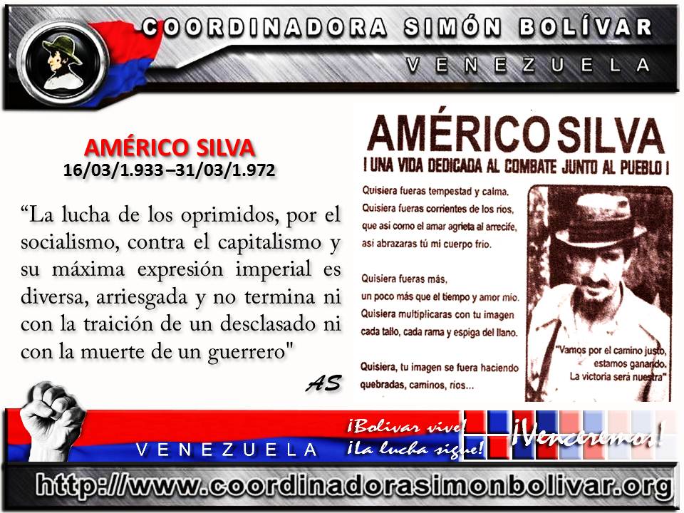 Hermanos y Hermanas: En este reciente marzo rebelde se cumplieron ochenta y cinco (85) años del nacimiento y cuarenta y seis (46) años de la siembra de AMÉRICO SILVA, cariñosamente llamado "El Flaco", nativo de Aragua de Maturín, Edo. Monagas, donde nació el 16 de marzo de 1.933, muerto por sus ideales cerca de las inmediaciones del Pao, Edo. Bolívar el 31 de Marzo de 1.972, a manos de algunos miembros de la Guardia Nacional en el kilómetro 27 de la carretera del Pao en San Félix-Edo. Bolívar.