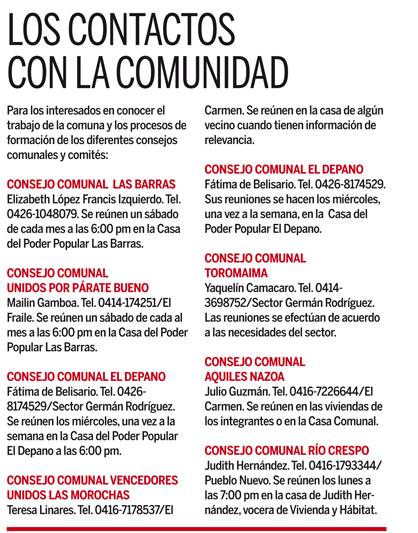 La comuna la conforman 13 consejos comunales: Unidos por Párate Bueno y El Fraile parte baja (sector del mismo nombre); Río Crespo (Pueblo Nuevo); Conapun (entre Pueblo Nuevo y Altos de La Iglesia); Unidos por Nuestra Comunidad (sector Santa Elena); El Depano; Simón Rodríguez; Toromaima y Rincón de México (Germán Rodríguez); La Batea (El Carmen); Las Barras y Párate Bueno; Vencedores Unidos Las Morochas, y Aquiles Nazoa (El Carmen).
