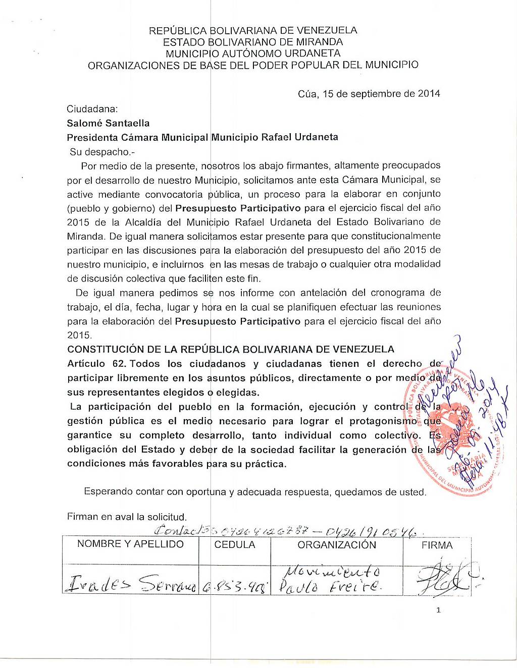 Desde el Municipio Rafael Urdaneta nos hacemos sensible y asumimos esta iniciativa, para exigir a los organismos pertinentes garantizar los mecanismos para que el pueblo se haga partícipe en el debate de nuestro presupuesto. Por esta razón dirigimos una comunicación a la Ciudadana Salomé Santaella (Presidenta de la Cámara Municipal) y miembro del Partido Socialista Unido de Venezuela, quién siendo consecuente con el Proyecto Socialista y de participación protagónica debiera ponerse al frente de esta exigencia. De igual manera se le hizo la misma solicitud a la camarada Adyanis Noguera Alcaldesa del Municipio Rafael Urdaneta