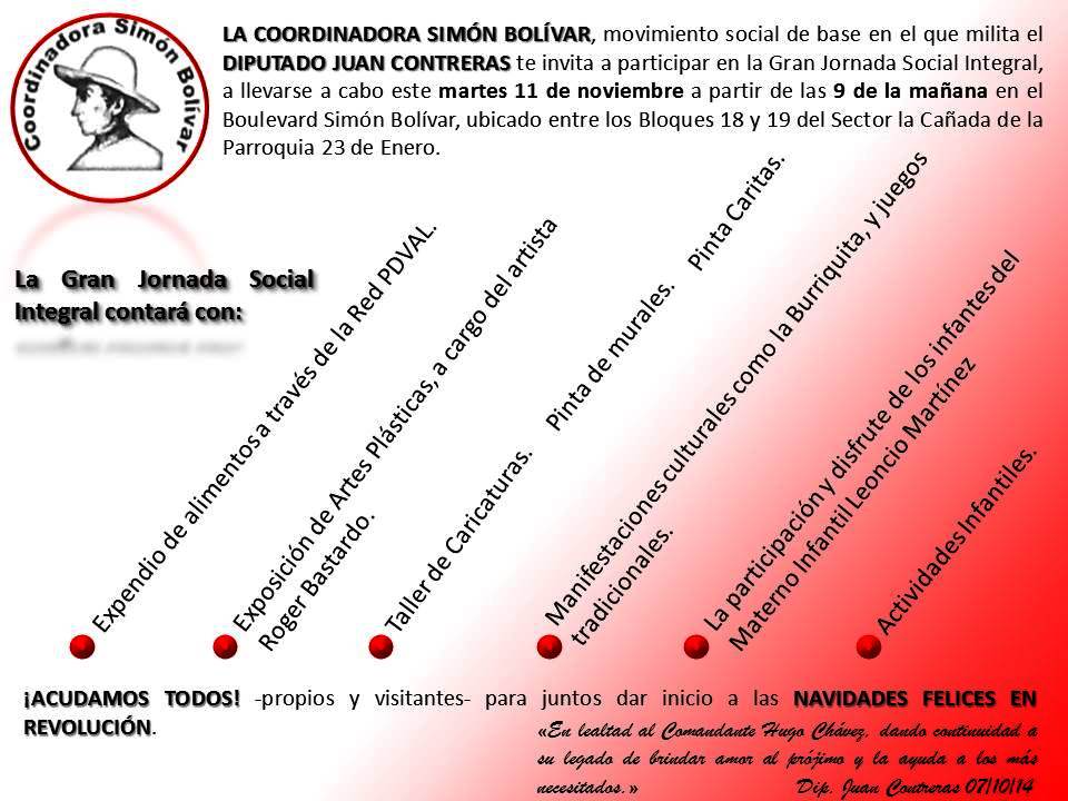 La Coordinadora Simón Bolívar, movimiento social de base en el que milita el Diputado Juan Contreras, te invita a participar en la Gran Jornada Social Integral, a llevarse a cabo este martes 11 de noviembre a partir de las 9 de la mañana en el Boulevard Simón Bolívar, ubicado entre los Bloques 18 y 19 del Sector la Cañada de la Parroquia 23 de Enero.