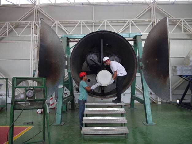 Luego se llenan los moldes (el cilíndrico con 10,5 kilos y el otro con 18 kilos), que más tarde por la acción de la rotación y el calor, se van formando los recipientes que en una hora están listos para darle los toques finales como separarlos de la tapa y cortar los bordes.