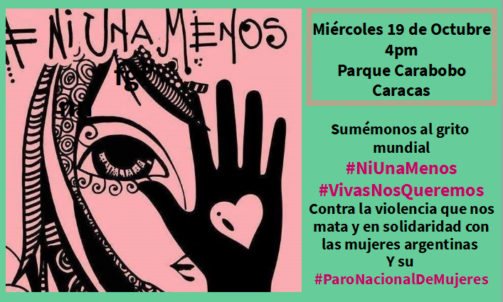 La violencia machista asesina a una mujer Argentina cada 30 horas, esta semana que pasó, asesinó a 1 cada 24 horas. La represión, la violencia y el feminicidio es una realidad latinoamericana y mundial. En Venezuela en lo que va del año 2016, solo en Caracas se han perpetrado 133 feminicidios, sin que eso alarme a nadie. Por esa razón salimos no solo a solidarizarnos con el 1er Paro Nacional de Mujeres que estarán haciendo las compañeras argentinas este 19 de octubre, sino a visibilizar una realidad que es ignorada por la sociedad venezolana, una realidad que nos maltrata y nos alerta de la necesidad de conquistar en las calles más derechos para las mujeres venezolanas.