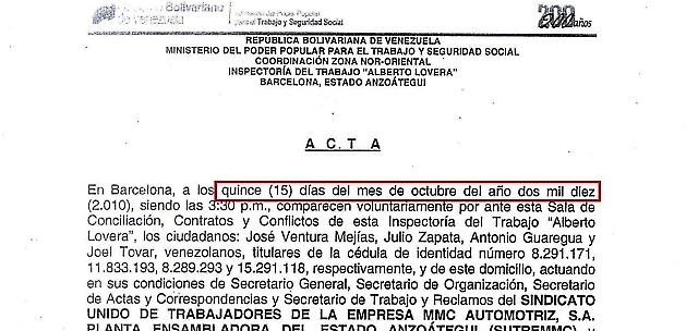 Cabe mencionar que después del recibimiento de dicho anteproyecto no hubo ningún auto por parte de la inspectoría del trabajo para convocar a las partes para iniciar el acto conciliatorio de discusión de contrato, por lo contrario se celebró una reunión privada entre la gerencia de Mitsubishi y los seudodirigentes de Sutremmc, donde acordaron iniciar las discusiones el día 25 de octubre de 2010 sin previa autorización mediante auto por parte de la inspectoría de trabajo.