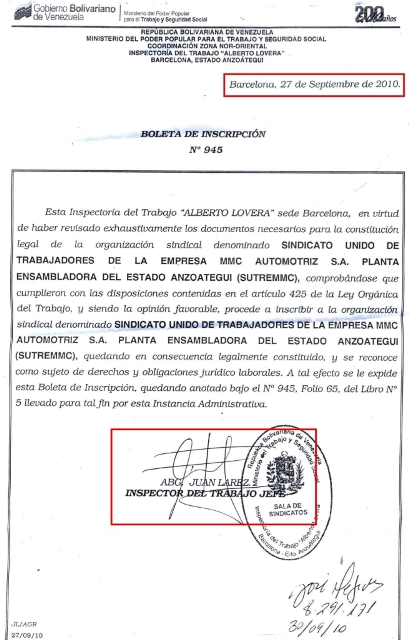 23 de noviembre de 2010.- Como parte del golpe de estado silencioso a la revolución que han denunciado los trabajadores en los distintos medios de comunicación, la semana pasada la inspectoría del trabajo de Barcelona certificó una convención colectiva del sindicato patronal e ilegalmente constituido en la empresa Mitsubishi de Barcelona. Entre gallos de media noche y procedimientos irregulares funcionarios del Ministerio del Trabajo aprobaron dicha convención colectiva con la intensión de que la empresa Mitsubishi logre obtener la solvencia laboral para el año 2011. Como se ha denunciado en los distintos medios de comunicación los funcionarios del ministerio del trabajo; Elio Almeida, director nacional de mediación, conciliación y arbitraje; Ramón Huiza, Director nacional de relaciones laborales; Jeaneth Sabino, adjunta a la dirección nacional de relaciones laborales, Juan Lárez, inspector jefe de la inspectoría del trabajo de Barcelona y Adriana Ascanio, jefa de la sala de conciliación, contratos y conflictos de la inspectoría del trabajo de Barcelona. Estos funcionarios han sido pieza clave para llevar a cabo este plan nefasto que favorece a la transnacional Mitsubishi y desmejorar las condiciones de trabajadores y seguridad y salud de los trabajadores que laboramos en esta empresa.