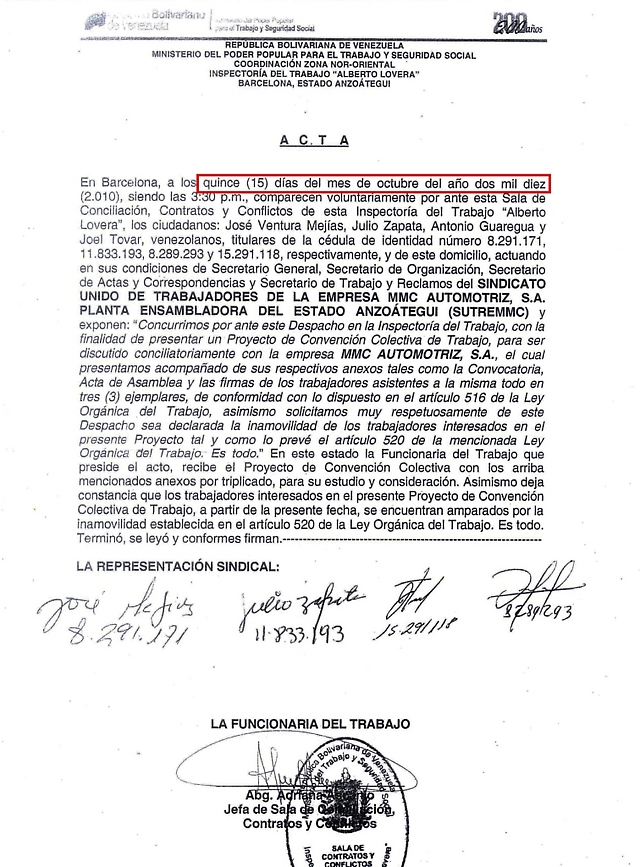 Para agilizar dicho plan los funcionarios del ministerio del trabajo facilitaron a los seudodirigentes del sindicato patronal Sutremmc una copia de la convención colectiva entregada por Singetram en octubre de 2009 ante la inspectoría del trabajo de Barcelona, con el objetivo de modificarla a conveniencia de la transnacional Mitsubishi y ser aprobada lo antes posible sin cumplir con los procedimientos de ley. Como se muestra en el documento firmado por el inspector Jefe Juan Lárez (imagen No. 1), el sindicato Sutremmc fue certificado el día 27 de septiembre de 2010, posteriormente se muestra el acta de recibimiento del anteproyecto de convención colectiva (imagen No. 2) por parte de la funcionaria Adriana Ascanio, con fecha 15 de octubre de 2010, a escasos 15 días hábiles después sin cumplir con el debido proceso para su elaboración fue aceptado.