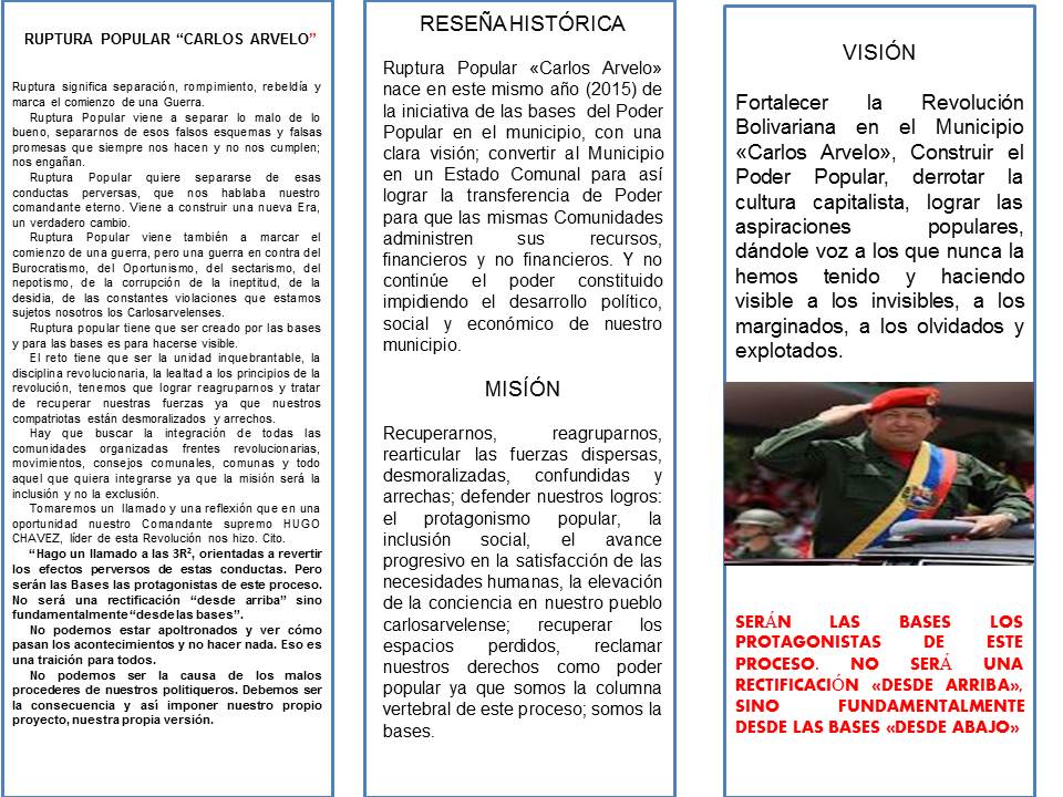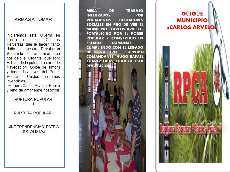 En el Municipio Carlos Arvelo esta creciendo una esperanza. Un conjunto de activistas y militantes del proceso bolivariano ha dicho basta a la imposición y al silencio. Organizados en mesas de trabajo y discusión colectiva se han dispuesto a difundir un proyecto para Carlos Arvelo y el estado Carabobo, basados en la democracia participativa y directa y el pensamiento critico. Jose Gregorio Rojas, participante de este colectivo y dirigente del movimiento de dispacacitados a nivel regional nos explica ¨queremos construir una alternativa para aquellos que piensan que los mecanismos de participacion existentes ya se estan quedando estancados, eso si NUNCA para mirar a la derecha¨