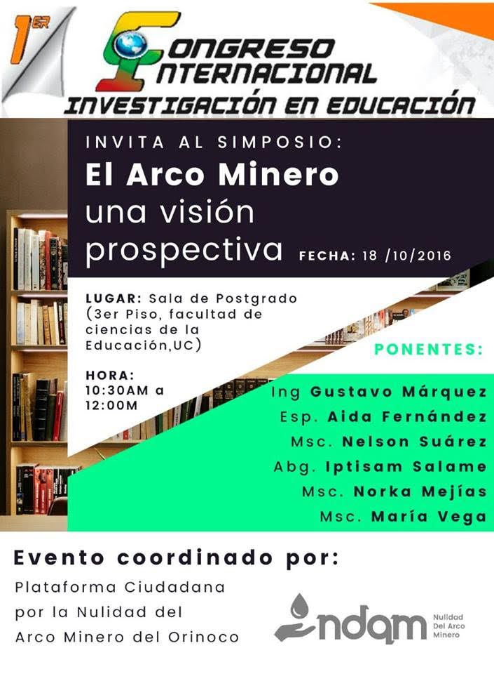 El Primer Congreso Internacional "Investigación en Educació", invita al Simposio El Arco Minero: Una Visión Prospectiva, el cual se llevara acabo el día Martes 18, de 10:30 am a 12:00 m en la Universidad de Carabobo, Facultad de Ciencias de la Educación, Sala de Posgrado 3er. Piso.