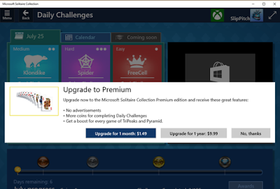 Una de las revelaciones dadas a conocer este 29 de julio es que el juego Solitario, que ha venido con todas las versiones de Windows desde 1990, ahora viene con publicidad en Windows 10, que aparece en la forma de videos en pantalla completa. Además, al iniciarlo, el juego te ofrece actualizarlo a la versión Premium: pagando $1,50 mensual podrás eliminar dicha publicidad y obtener algunas monedas para tener ventaja en el juego.