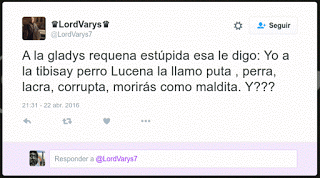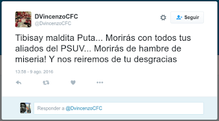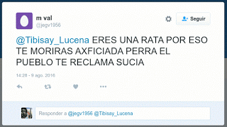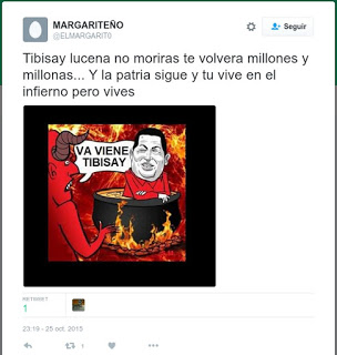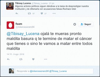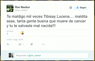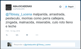Por estas razones, vemos que, a través de Twitter, llueven las amenazas y ataques contra la presidenta del CNE, Tibisay Lucena. Se llama a asesinarla, se invoca su muerte de todas las formas posibles, incluso recordando que ella padeció de cáncer.