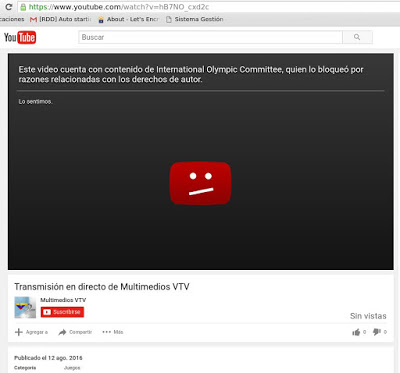 Youtube también bloqueó un video del programa "En Contacto con Maduro" #63 que subí y duraba 4 horas y 15 minutos, debido a que contenía menos de 2 minutos de video de las Olimpiadas mostrando el desempeño de una atleta venezolana. Youtube bloqueó el video apenas terminó de subir; tuve que editarlo, colocar en negro el fragmento en cuestión y volver a subirlo, para que Youtube lo aceptara.