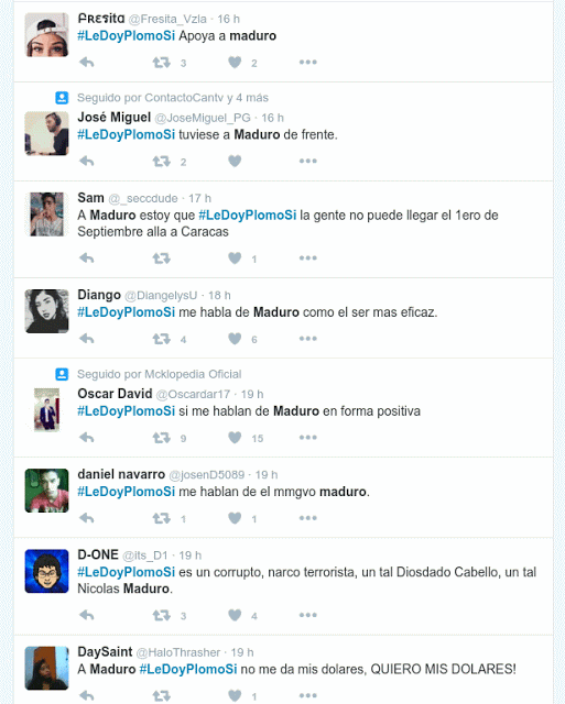 Y la polarización nuevamente vuelve a crecer. Estos son tuits de este sábado 26 de agosto en la noche. Para encontrarlos, sólo tuve que buscar la etiqueta #LeDoyPlomoSi (que estuvo de segundo lugar en las tendencias de Twitter aquel día, y ya por sí misma constituye un llamado a la violencia) y el apellido del presidente venezolano: