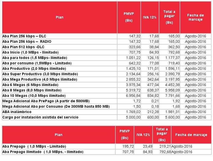 El plan ABA de 256 kbps -DLC costará 165 bolívares, mientras que el plan de ABA Productivo de 2,0 Mbps ilimitado valdrá 1.596,11 bolívares.