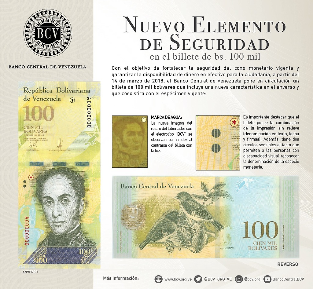 Marzo 13 de 2018.- El Banco Central de Venezuela (BCV) informa a la población que a partir de este miércoles 14 de marzo entra en circulación en el territorio nacional una versión del billete de 100 mil bolívares, que incorpora un nuevo elemento de seguridad.