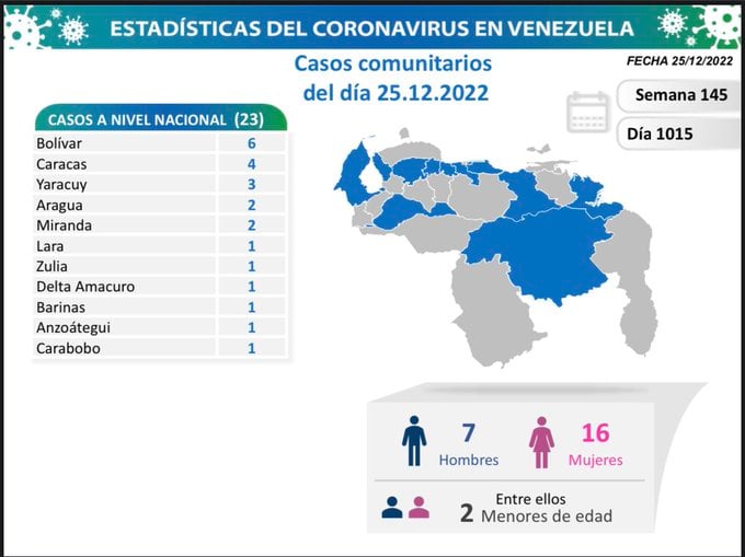 Bolívar es el estado que este domingo #25Dic registra el mayor número de nuevos casos comunitarios (6), con contagios activos en 1 municipio; seguido por las entidades: Caracas (4), Yaracuy (3) y Aragua (2).