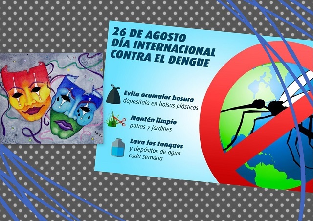 Cartel de campaña con indicaciones para combatir al mosquito y vector del dengue. Imagen de máscaras de teatro (procedente de Zazzle.com y tomada de http://gaceta.cusur.udg.mx/dia-internacional-del-actor).
