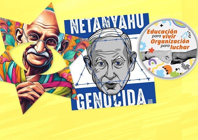 Imágenes alusivas a efemérides destacadas: Gandhi como representante de la No Violencia; Netanyahu como expresión de la violencia llevada al extremo del genocidio y crímenes contra la humanidad, el Día de la Educación Social (tomamos un eslogan de la central sindical española CCOO)