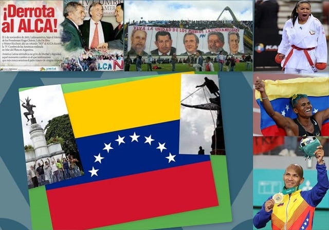 Imágenes alusivas a las Efemérides del 5 de Noviembre, destacadas en la versión 2024: Abajo, el lado izquierdo de la bandera nacional el monumento al cacique Guaicaipuro que reemplazó a la estatua de Colón derribada por activistas autónomos del movimiento popular venezolano. Arriba gobiernos y manifestantes protagonistas del ¡No Al ALCA! en 2005 y al costado derecho de arriba a abajo, ganadora y ganadores de preseas de oro por Venezuela en los Panamericanos de 2023 en Santiago de Chile.