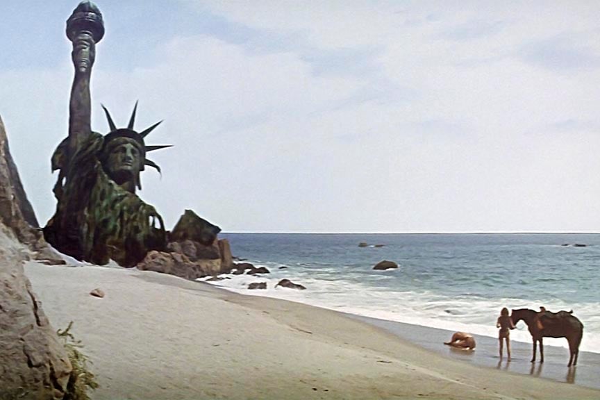 Al final de El planeta de los simios, famosa película de ficción científica situada en el siglo XXXIX y basada en la novela de Pierre Boule, el astronauta estadounidense sobreviviente al secuestro a que fue sometido su grupo por los simios dueños de ese planeta, descubre que éste es la Tierra, al hallar en la arena de una playa restos de la cabeza de la Estatua de la Libertad, símbolo de nuestro planeta.