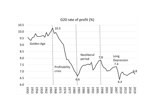 La tendencia decreciente de la tasa de ganancia —ilustrada por los datos del analista Michael Roberts para el G20— muestra una presión secular sobre la rentabilidad. Desde un 9.6% en 1950, la tasa cayó al 7.4% en 1990 y se mantuvo alrededor del 6.8% en 2019.
