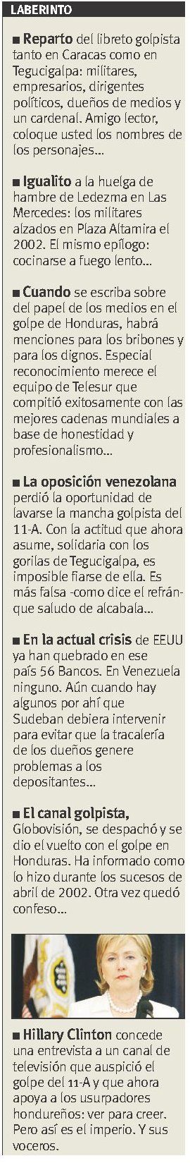 El formato aplicado en Venezuela hace siete años se repitió el domingo 28 de junio en Honduras. Participaron en la nueva aventura contra el orden constitucional y el mandato de un presidente legítimo, oligarcas hondureños, empresarios, políticos mafiosos, la costra de los corruptos, terratenientes, y explotadores maquileros. La confabulación de poderes que se dio en este golpe confirma la pudrición imperante en la política del país centroamericano: jueces venales y parlamentarios coimeros. En lo que se refiere a la Fuerza Armada hay que recordar que se trata de una de las más penetradas por el establecimiento militar norteamericano. La Fuerza de Tarea Conjunta Bravo de la Base Soto Cano, ubicada en Palmerola, funciona como un subcomando del Comando Sur de USA. No es, por tanto, una Base cualquiera. Fue montada para combatir la insurgencia en la región y reprimir al movimiento popular con los recursos más sofisticados en materia de comunicación y operatividad.