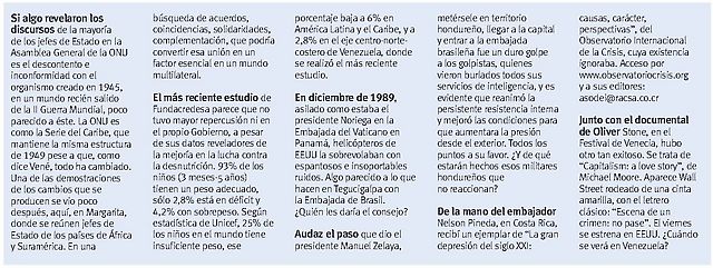 En esa misma línea de "preocupación" se mostró el presidente Uribe en la ONU. No puede dormir, le hace mucha bulla el ritmo de "la carrera armamentista", que algunos sustentan en la necesidad de modernizar sus equipos militares, mientras otros confiesan su "ánimo de guerra", en alusiones a Venezuela y Ecuador. Colombia puede renovar su flota aérea en Israel y recibir la tercera ayuda militar más cuantiosa de EEUU en el mundo; puede, igualmente, ceder siete bases a fuerzas militares de EEUU, y nada de eso se llama armamentismo. De cuantas declaraciones escuchadas o leídas sobre este asunto, ninguna tan cínica.