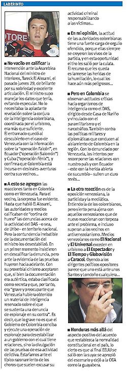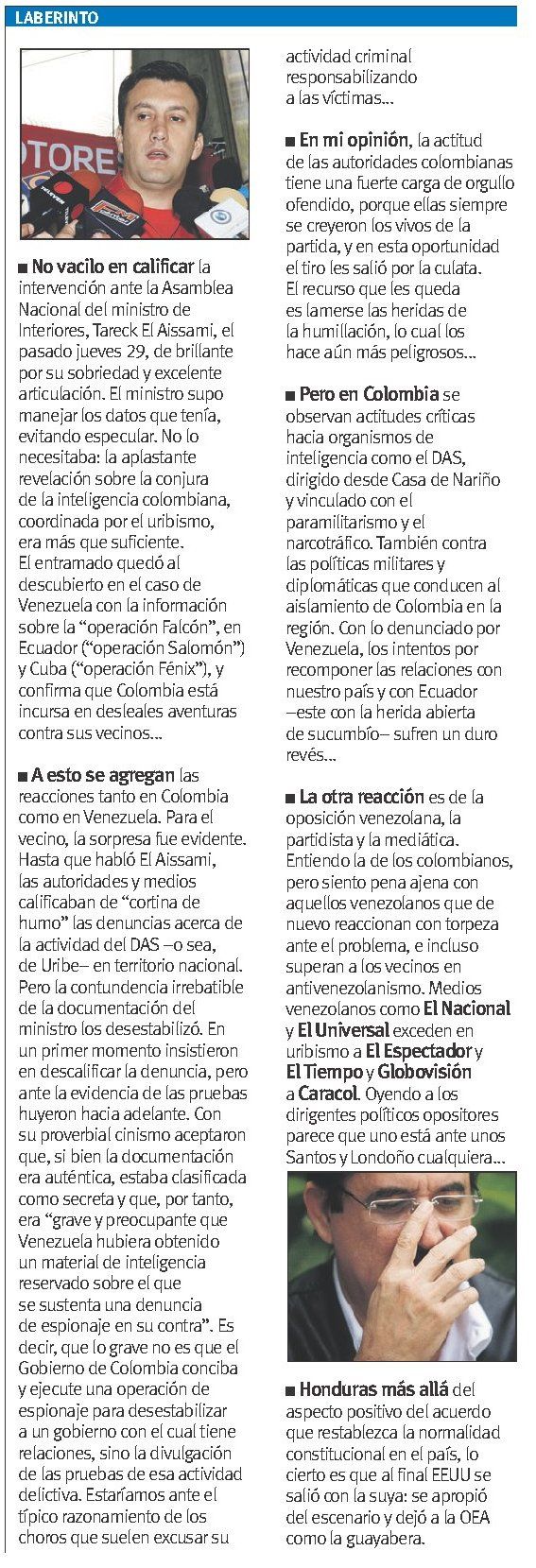 Dicen que el dictador mexicano Porfirio Díaz exclamó una vez: "¡Pobrecito México: tan lejos de Dios y tan cerca de Estados Unidos!". Cierto o no, hay vecindades que son un suplicio. Con Colombia, la situación siempre fue incómoda. La oligarquía de ese país, su clase dirigente, sus mandos militares, mantuvieron una constante hostilidad hacia Venezuela que se traduciría en despojo territorial, ventajas económicas, vaciamiento en nuestro país de la violencia que anida en su seno: paramilitares, narcotraficantes y delincuencia común. En más de una oportunidad, el núcleo de poder colombiano montó contra Venezuela provocaciones descaradas. Sin ir muy lejos, está la emblemática experiencia de la corbeta ARC "Caldas", colocada en agosto de 1987 en el golfo de Venezuela por el entonces presidente Virgilio Barco. Ese acto artero, realizado con el propósito de probar la capacidad de respuesta de Venezuela, estuvo a punto de desatar un conflicto armado de impredecibles proporciones, con el cual se atentó contra la soberanía nacional, lo mismo que a través de otras acciones con similares características como el secuestro por efectivos de la inteligencia colombiana de Rodrigo Granda; y ahora lo complementa la trama de la "operación Falcón", urdida por el DAS con anuencia de Uribe, para infiltrar agentes y promover la desestabilización del gobierno de Chávez.