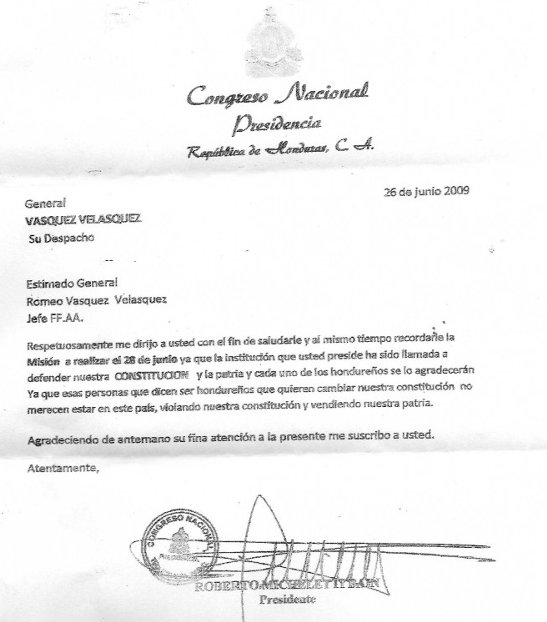 En la carta que está fechada el día 26 de junio, dos días antes del golpe de estado, se puede ver el sello del Congreso Nacional y la firma de Micheletti.